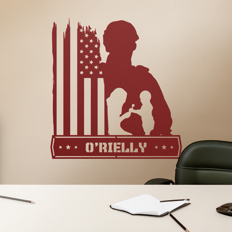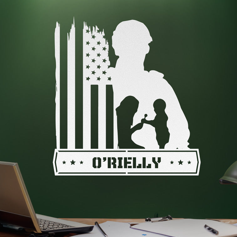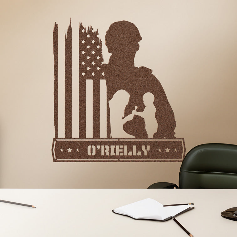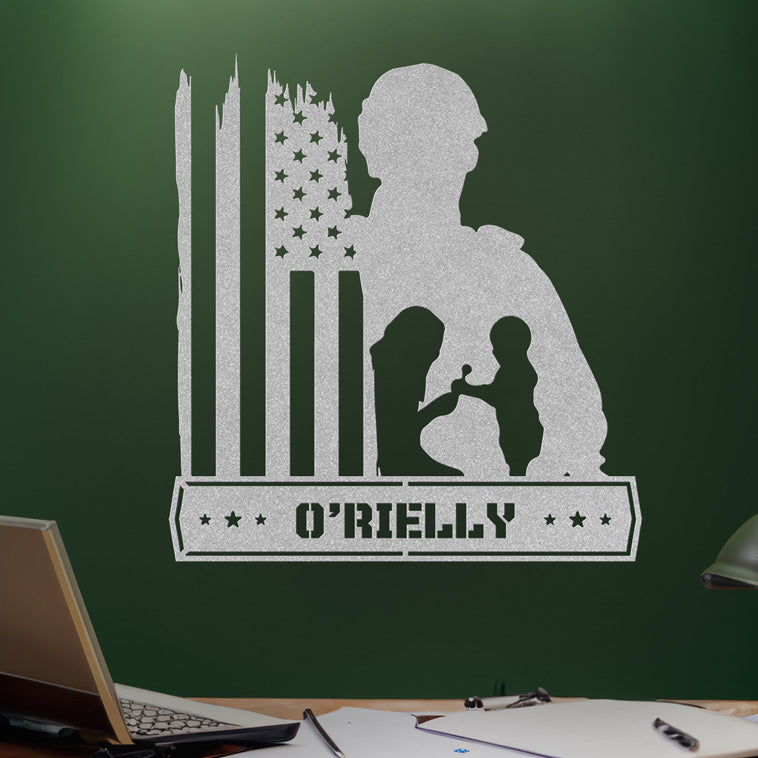 Honor service and sacrifice with this custom Military Tribute Metal Sign. Featuring a striking silhouette of a soldier with their family inside and a tattered American flag backdrop, this piece is a heartfelt tribute to those who serve.